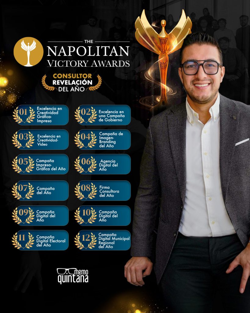 Este año The Napolitan Victory Awards premió a lo mejor de la comunicación política de 2024, donde Comarka figuró con 13 nominaciones, entre ellas; Consultor Revelación del Año (Memo Quintana).