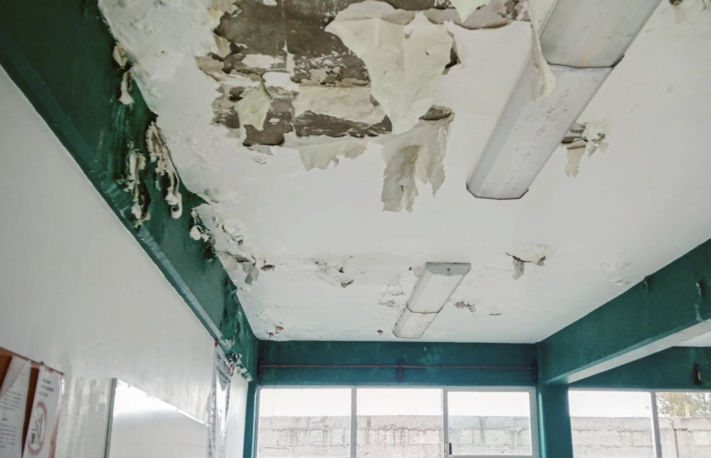 Fotografías hechas llegar a Transición Mx, muestran el serio deterioro de aulas que por la humedad están perdiendo parte de la pintura en techos y paredes, también, otras donde hay presencia de goteras.