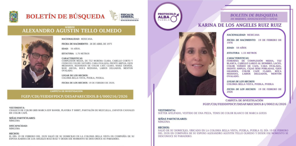 La Fiscalía del Estado de Puebla ya emitió boletines de búsqueda para ambas personas, pues se teme, fueran privados de su libertad.